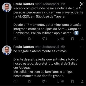 ‘Toda a estrutura do Governo foi mobilizada desde os primeiros minutos’, afirmou o governador. O governador de Alagoas, Paulo Dantas (MDB), manifestou profundo pesar pelo grave acidente registrado na Rodovia AL-220,