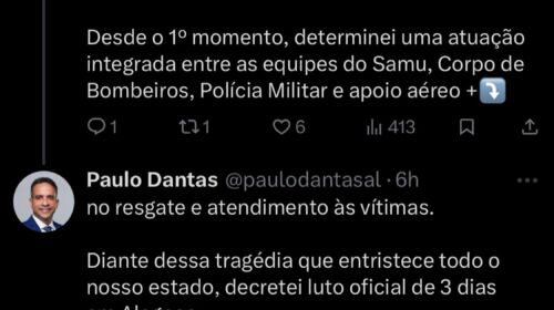 Paulo Dantas determinou a mobilização imediata de uma força-tarefa integrada para o atendimento aos envolvidos no acidente. O governador Paulo Dantas cancelou a agenda de inaugurações que cumpriria na manhã