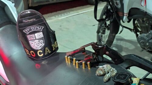 ROCAM encontrou arma e porções de maconha após denúncia no bairro Camuxinga. Uma ocorrência de posse irregular de arma de fogo foi registrada na noite da última segunda-feira (16), no
