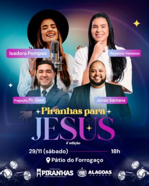 A cidade de Piranhas se prepara para viver um momento especial de fé e devoção com a realização da 4ª edição do “Piranhas Para Jesus”, marcada para o dia 29 de novembro, às 18h, no Pátio do Forrogaço. O evento, promovido pela Prefeitura de Piranhas, promete reunir fiéis de toda a região em uma noite de louvor, adoração e Palavra.