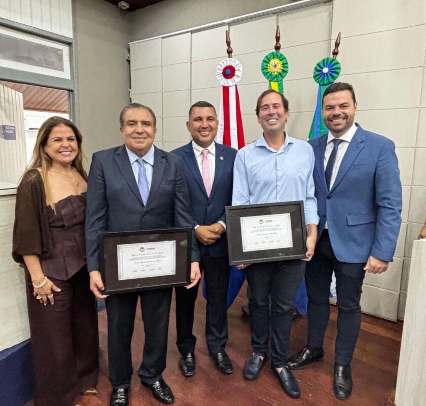 A Câmara Municipal concedeu, na tarde desta quinta-feira (11), os Títulos de Cidadão Honorário de Maceió ao deputado estadual Inácio Loiola e ao empresário e CEO do Réveillon Celebration, Sérgio Feitosa. As honrarias foram propostas pelo vereador Cal Moreira, aprovadas por unanimidade pelo parlamento e entregues durante sessão solene.⠀
