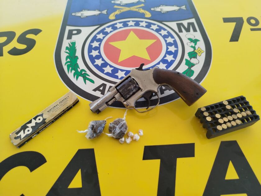 Durante a busca domiciliar, os policiais localizaram um revólver calibre .22, marca Rossi, com numeração suprimida, além de 29 munições intactas do mesmo calibre e seis estojos deflagrados. Também foi encontrada uma pochete contendo dois aparelhos celulares, sendo um Samsung e um Motorola, além de duas trouxinhas de substância análoga à maconha e cinco trouxinhas de substância análoga ao crack.