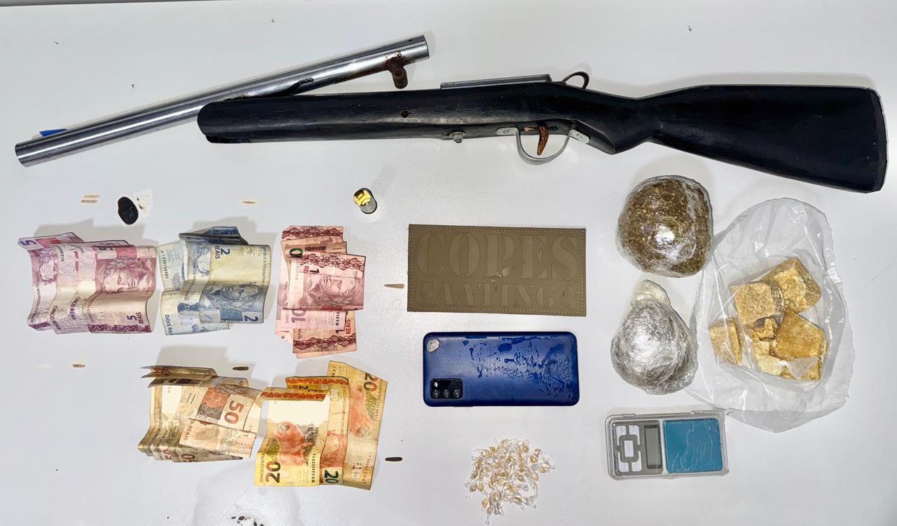 Na ação, foram apreendidos uma espingarda artesanal calibre 20, 214,6 gramas de crack, 196 gramas de maconha, além de R$ 392 em dinheiro, uma balança de precisão e um aparelho celular, itens que reforçam a prática do tráfico de drogas.