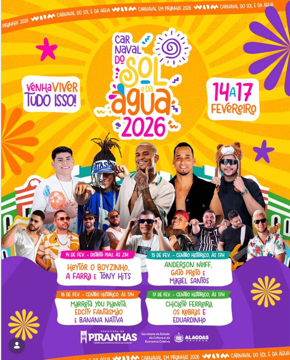 A Prefeitura de Piranhas anunciou oficialmente a programação do Carnaval do Sol e da Água 2026. O evento, que acontece entre os dias 14 e 17 de fevereiro, promete transformar o cenário histórico da cidade em um corredor de folia e cultura, atraindo turistas de todo o Nordeste.