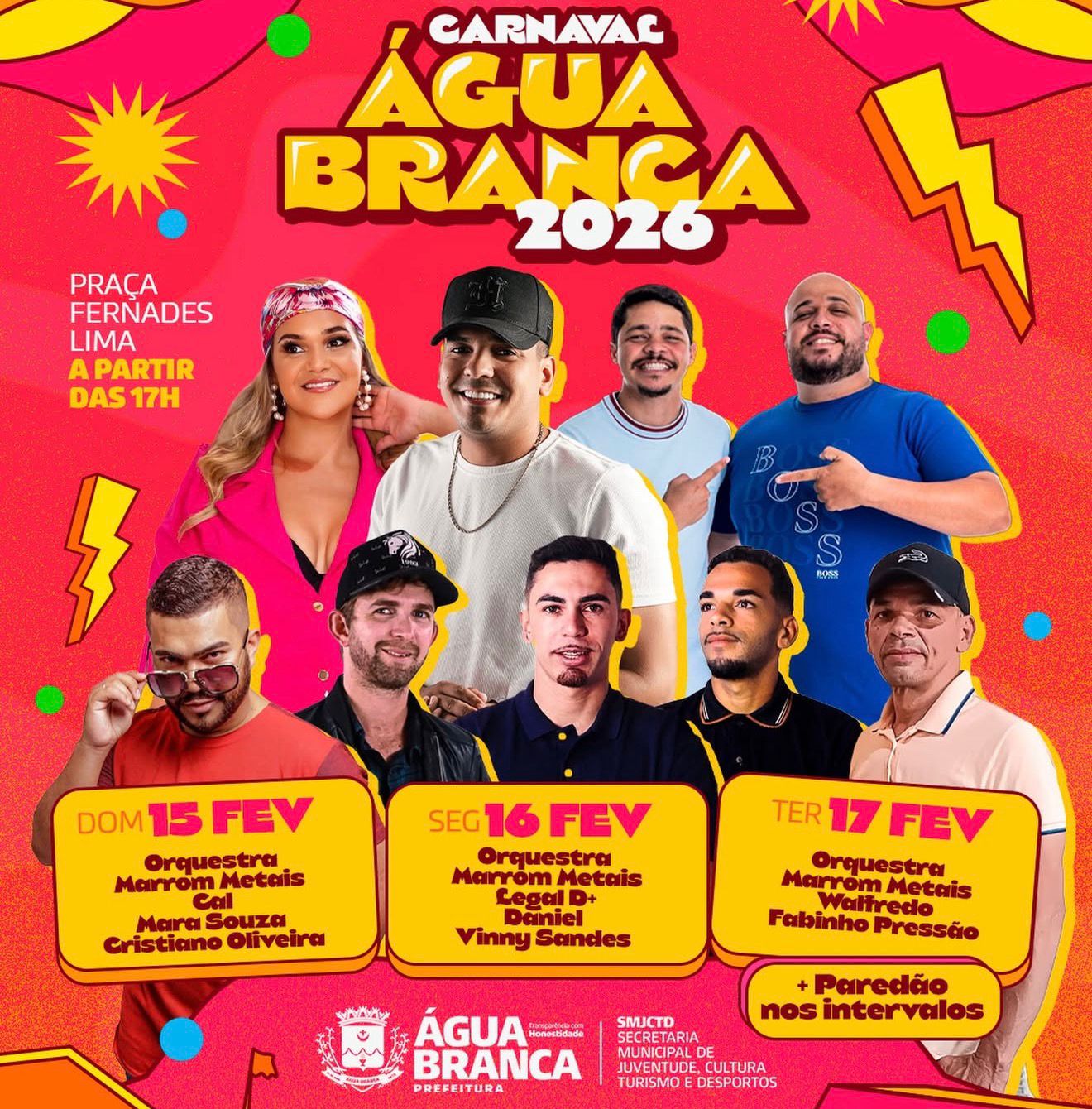 Os foliões de Água Branca já podem preparar a fantasia e puxar o bloquinho para o centro da cidade. A Prefeitura Municipal divulgou a programação oficial do Carnaval 2026, que promete levar muita alegria e diversão garantida para a Praça Fernandes Lima entre os dias 15 e 17 de fevereiro.