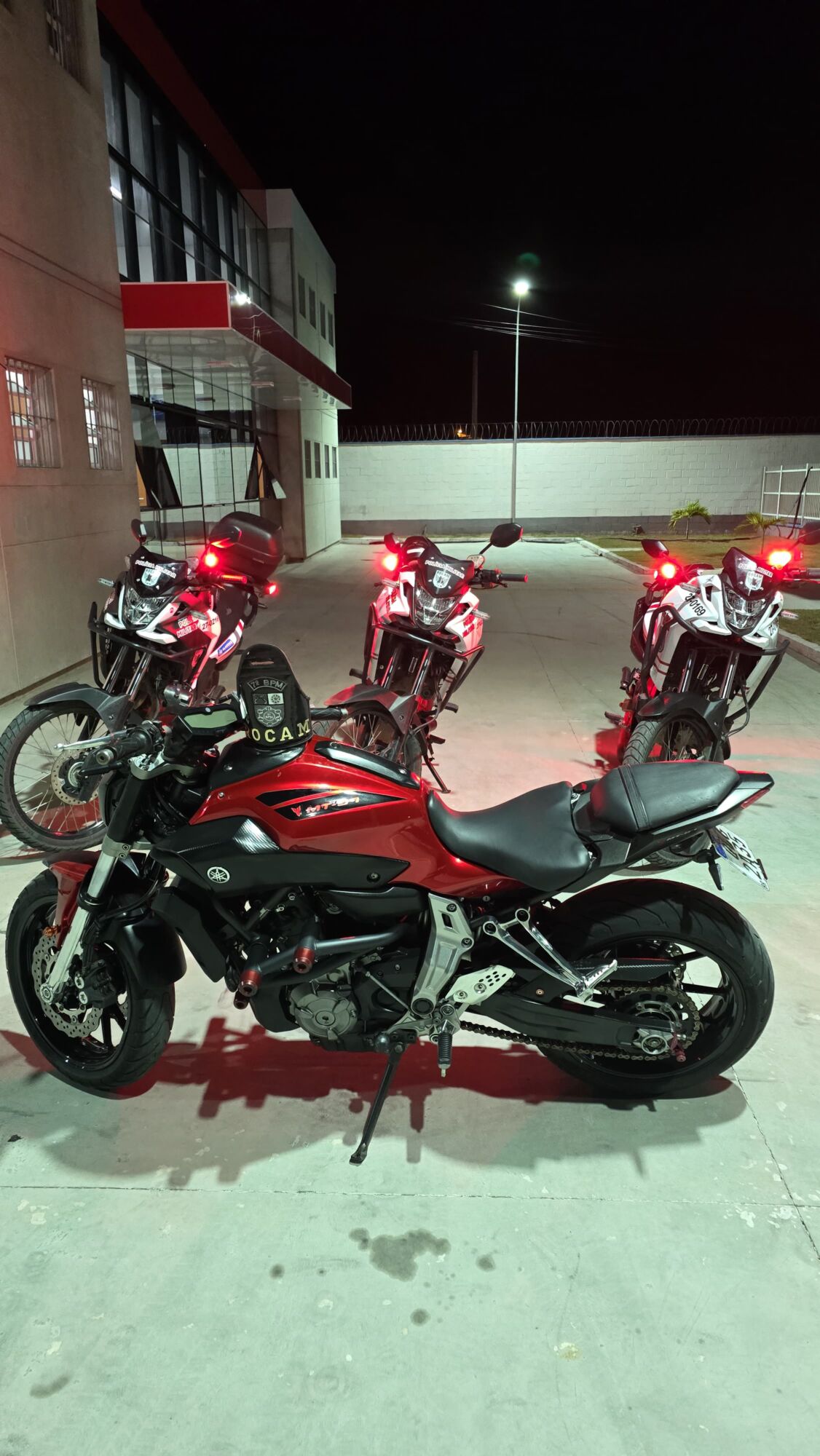 A motocicleta, de cores vermelha e preta, chamou a atenção dos policiais por estar com a placa de identificação totalmente levantada, manobra que impede a leitura da numeração por radares e agentes de fiscalização. Além da ocultação do sinal, o veículo operava com escapamento de descarga livre, o que gera poluição sonora excessiva.
