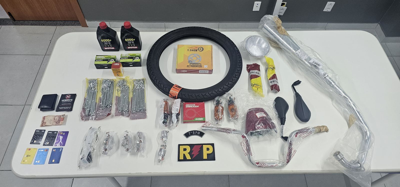 Entre o material apreendido estavam óleos de motor, pastilhas de freio, kits de enraiação, piscas, pneu, kit de transmissão, lâmpada de LED, maçaneta, disco de embreagem, retrovisores, lente de farol, cano de escape, guidom, além de seis cartões e uma carteira.