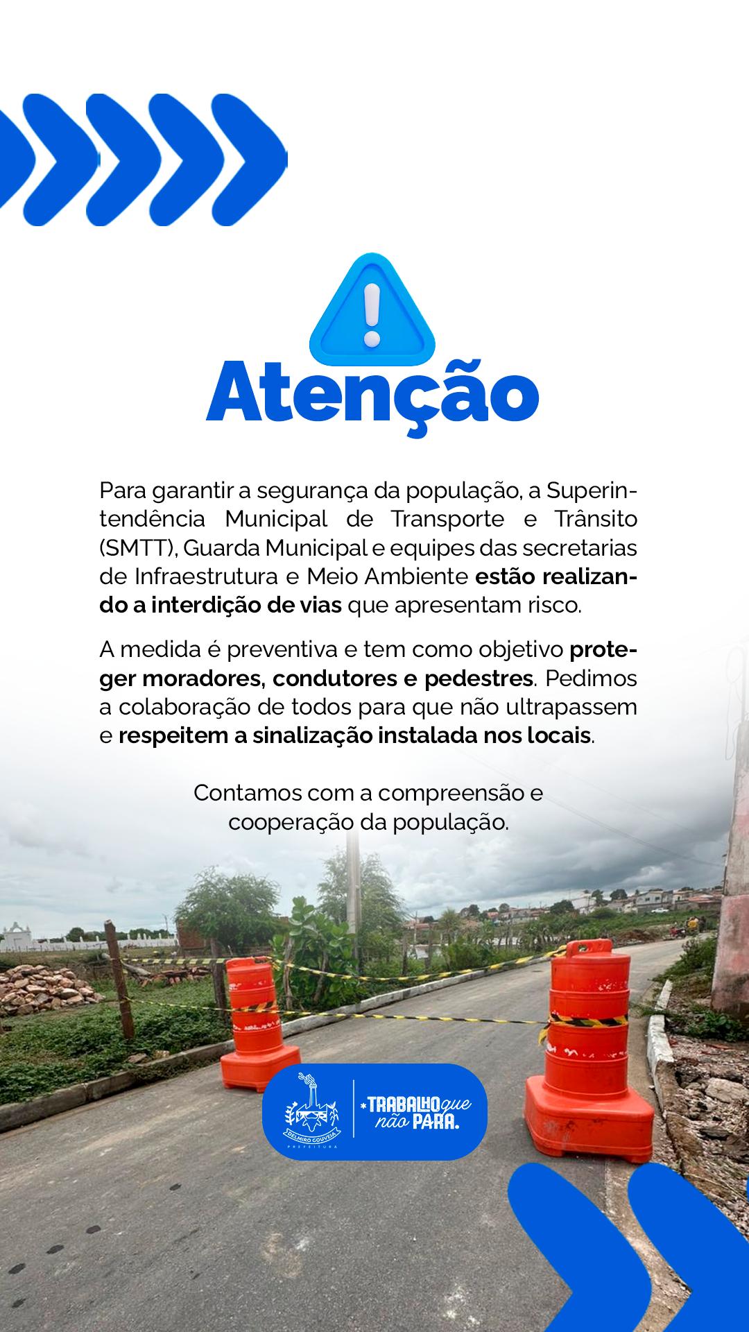 A gestão municipal reforça o pedido para que a população não ultrapasse as barreiras instaladas e respeite a sinalização colocada nos locais interditados. Em alguns pontos, tonéis e fitas de isolamento foram posicionados para impedir o tráfego de veículos e a circulação de pessoas.