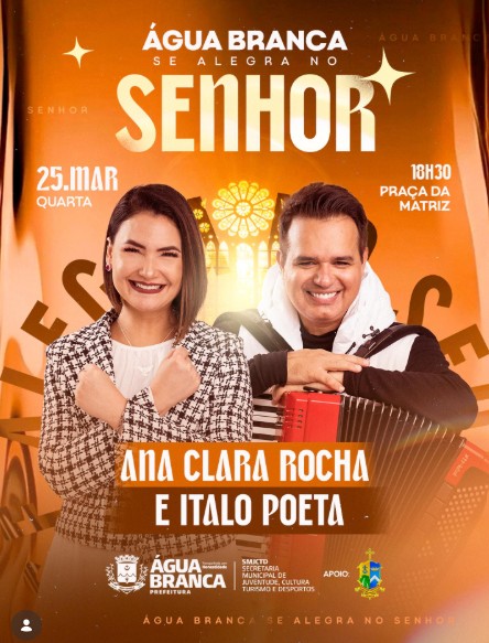 A prefeita de Água Branca, Nayara Emmanuela, utilizou suas redes sociais para compartilhar uma novidade que promete emocionar a comunidade local. A gestora confirmou a realização do evento cristão “Água Branca se Alegra no Senhor”, que contará com a apresentação da dupla Ana Clara Rocha e Ítalo Poeta.