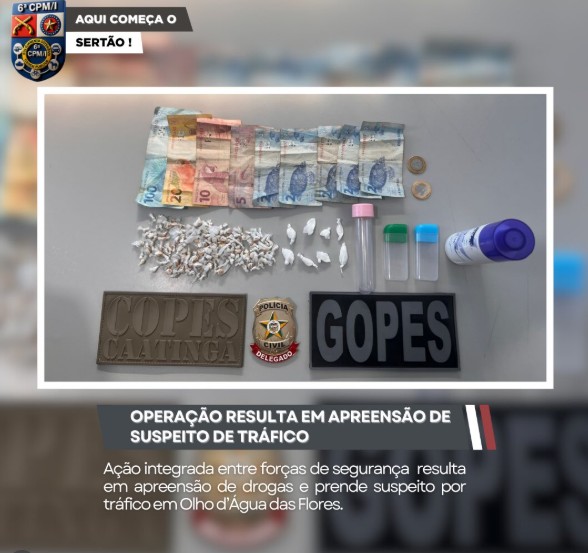 Uma ação integrada entre forças de segurança resultou na prisão de um suspeito por tráfico de drogas no município de Olho d’Água das Flores, no Média Sertão de Alagoas. A operação foi realizada por guarnições da COPES Caatinga, com apoio da Polícia Civil de Alagoas, por meio da delegacia local, e do GOPES da 6ª Companhia de Polícia Militar Independente.